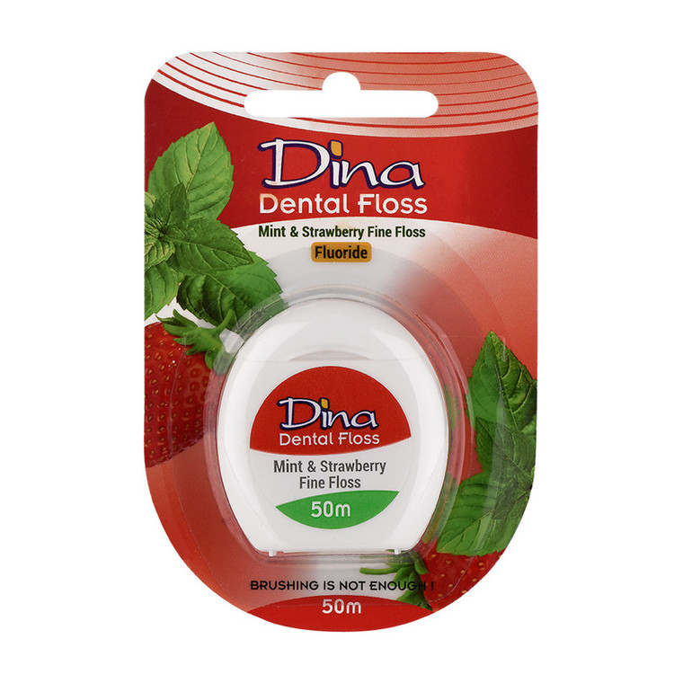 نخ دندان دینا با بافت ظریف و مقاوم و پوشش موم و اسانس طبیعی به راحتی روی لثه و بین دندانها سر خورده و پلاکهای دور از دسترس را جدا و تمیز می نماید . فلوراید اضافه شده به نخ دندان باعث بازسازی و استحکام مینای دندان می شود.