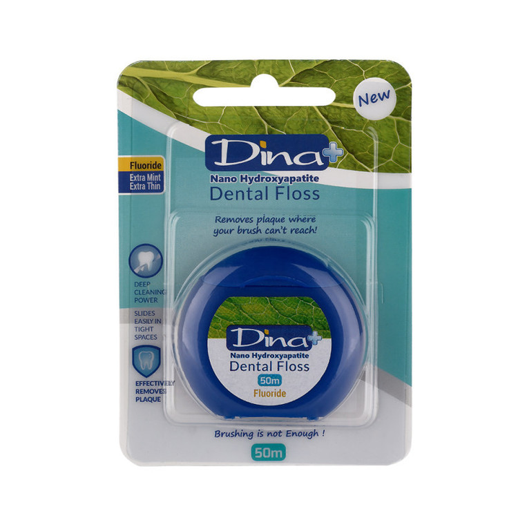 نخ دندان دینا با پوشش هیدروکسی آپاتیت.با آزاد کردن نانو ذرات هیدروکسی آپاتیت که به طور طبیعی در مینای دندان موجود است علاوه بر اینکه پلاکهای بین دندانها را برمیدارد موجب پوشش دادن منافذ کوچک بین دندانی می شود و حساسیت دندانی را کاهش می دهد .